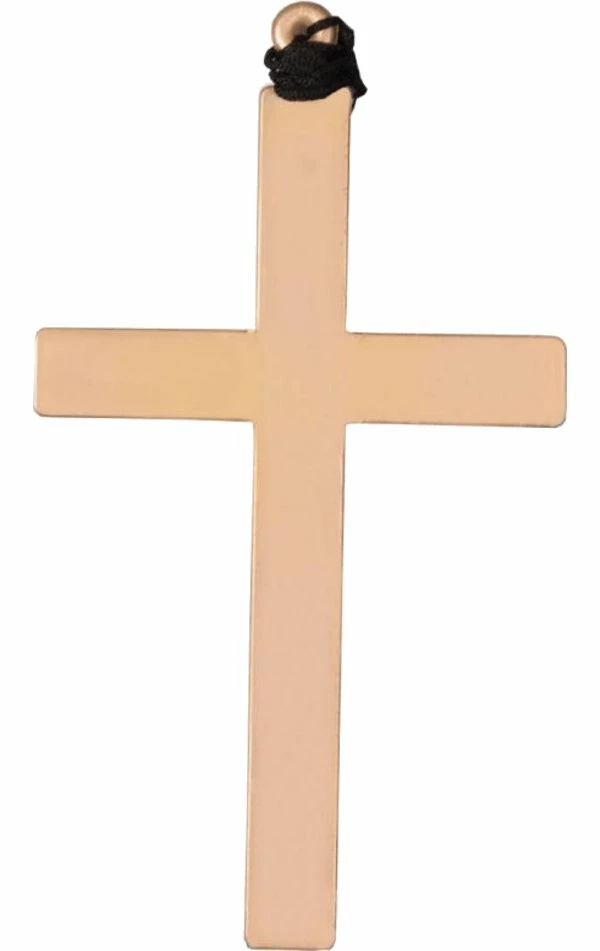 This large golden cross is made of moulded gold plastic and is worn around the neck on a black cord. The cross measures approx 20cm in length.
