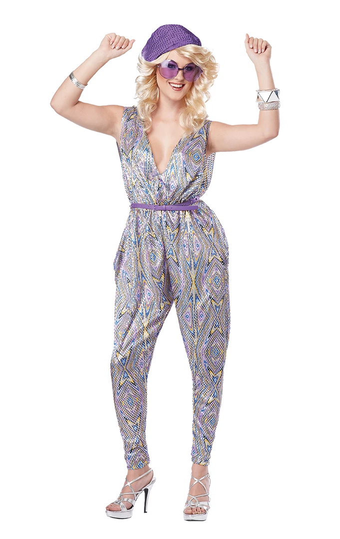 The Womens 70s Boogie Fever Costume is made up of a gorgeous, patterned jumpsuit in sparkling silver with a lilac belt attached and a cool matching lilac hat to complete your look.