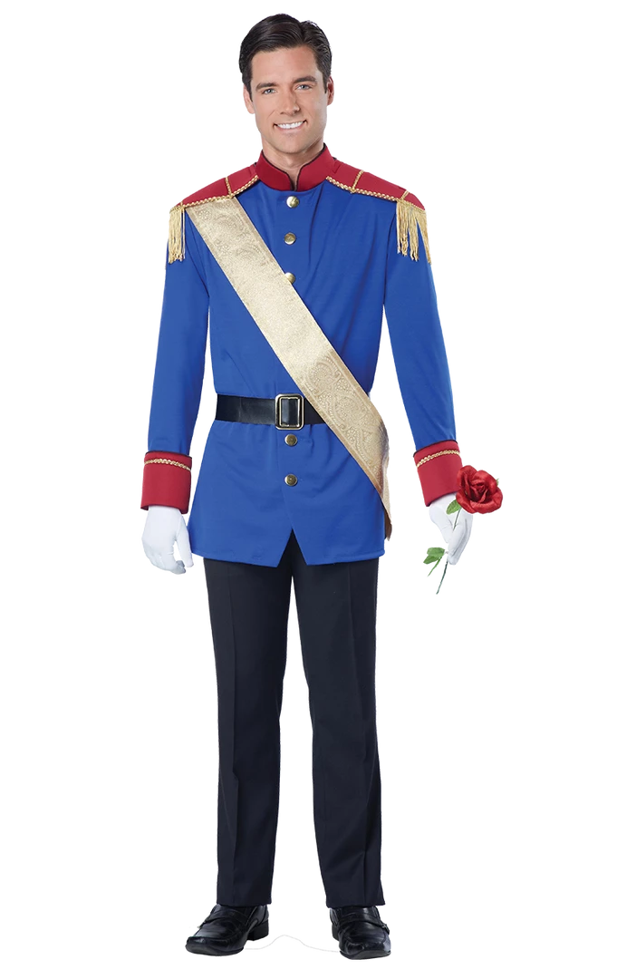 The Men’s Storybook Prince Costume comes complete with a blue long-sleeved jacket, featuring gold button detailing down the front and red detailing on the shoulders and the sleeves. Also included is a black belt to wrap around the waist, plus a gold sash. You are royal, after all.