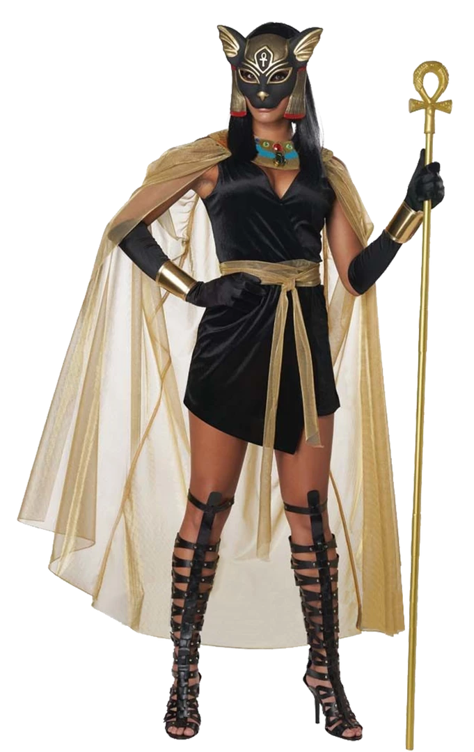 Become the beautiful ancient Egyptian Bastet the Cat, Goddess of Protection in the Womens Bastet Egyptian Goddess Costume. This sexy and slick high-quality costume features a black wrap dress with a plunging neckline, a gold sheer fabric belt, a matching cape attached to an Egyptian collar, gold wrist cuffs and a black and gold cat facepiece. Team up with a Pharaoh for the ultimate couples costume whether you’re celebrating Halloween or attending an Around The World themed party.