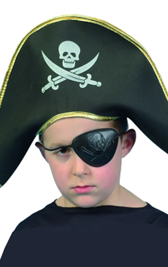 Kids Pirate with imprint of skull and crossbones and gold trim around the edges. This is a one size item designed to fit most children.