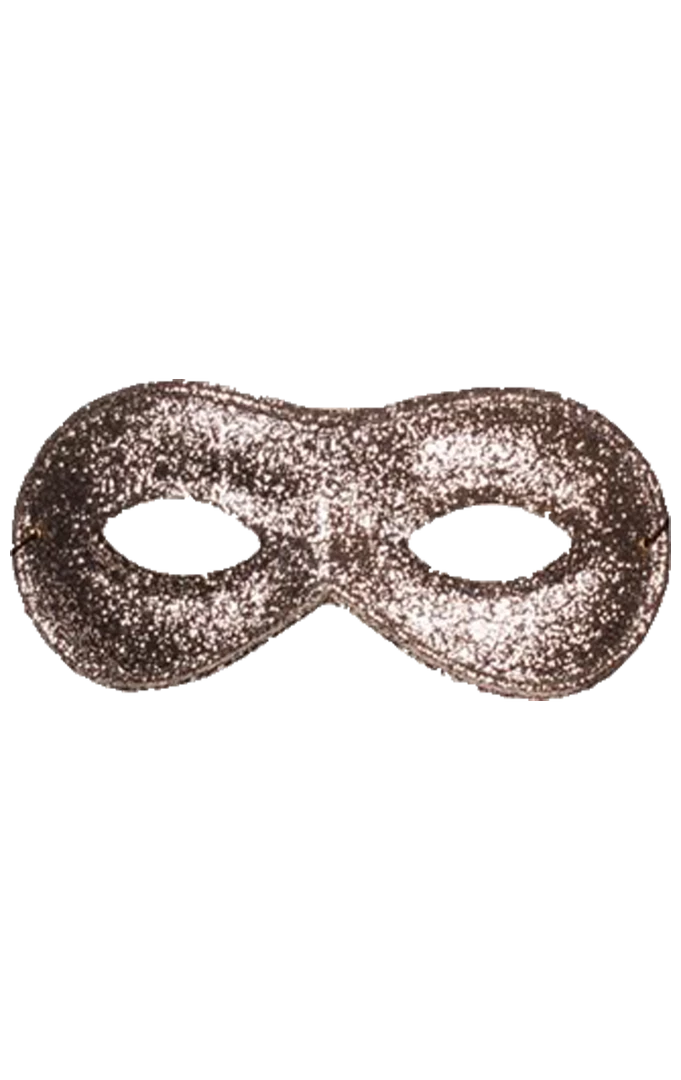 Small Silver glittery domino facepiece.Secures by loop of elastic. Width across the back of the facepiece is approximately 17cm.