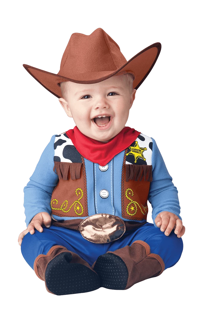 Our Baby Wee Wrangler Costume comes complete with an all-in-one blue jumpsuit, with a brown waistcoat detailing and red scarf. The costume also includes a pair of brown cowboy boots and a brown cowboy hat. YEE-HAH!