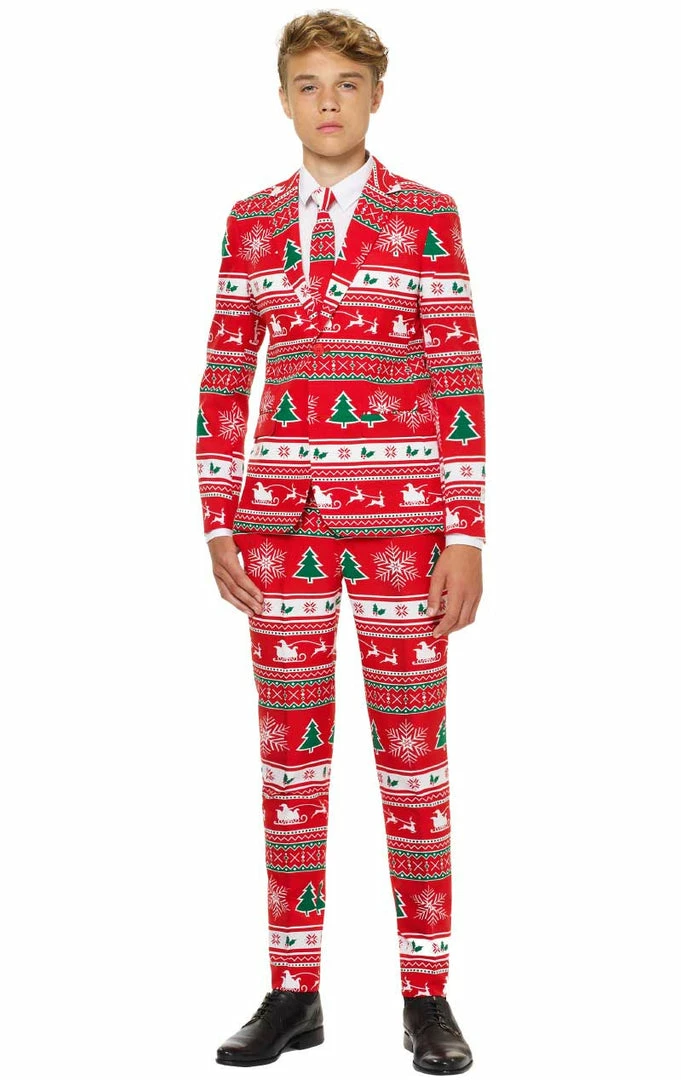 The Teen Winter Wonderland Opposuit is made up of a suit jacket and matching trousers. They feature a unique, merry pattern of Christmas motifs, using the traditional Christmas colours of red, green and white. A matching tie completes the look, so your teen can be looking smart as well as festive!