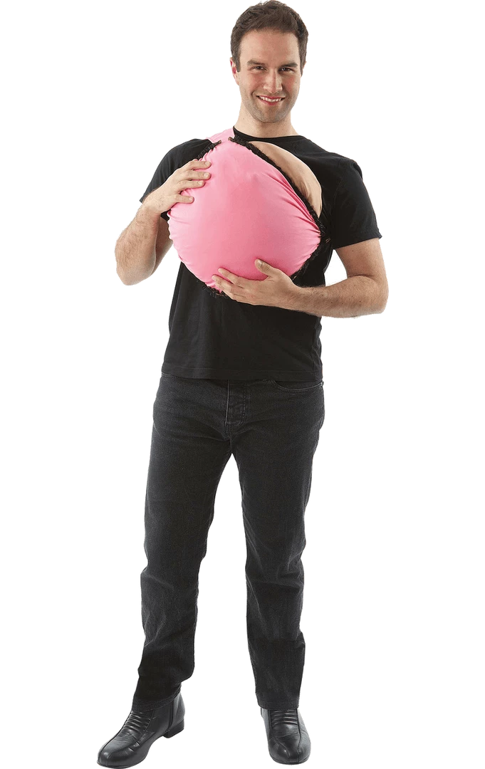 Our Adult Boob Bra Couples Costume comes complete with half a pink bra with a black lace effect. The outfit fits on over the head and sits comfortably all evening long. You’ll look perfect when twinning with your mate.