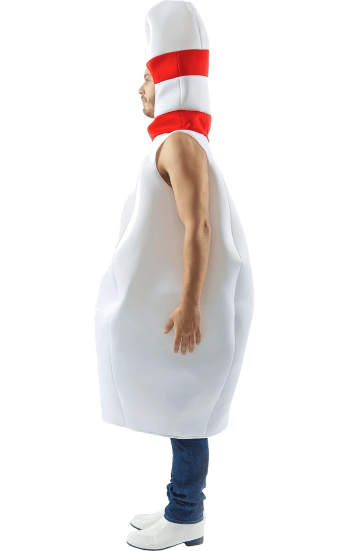 Our Adult Bowling Pin Costume features an all-in-one white suit with an arm hole on either side. It also include a matching headpiece with a red band accent, completing your look as the world’s most stylish bowling pin.