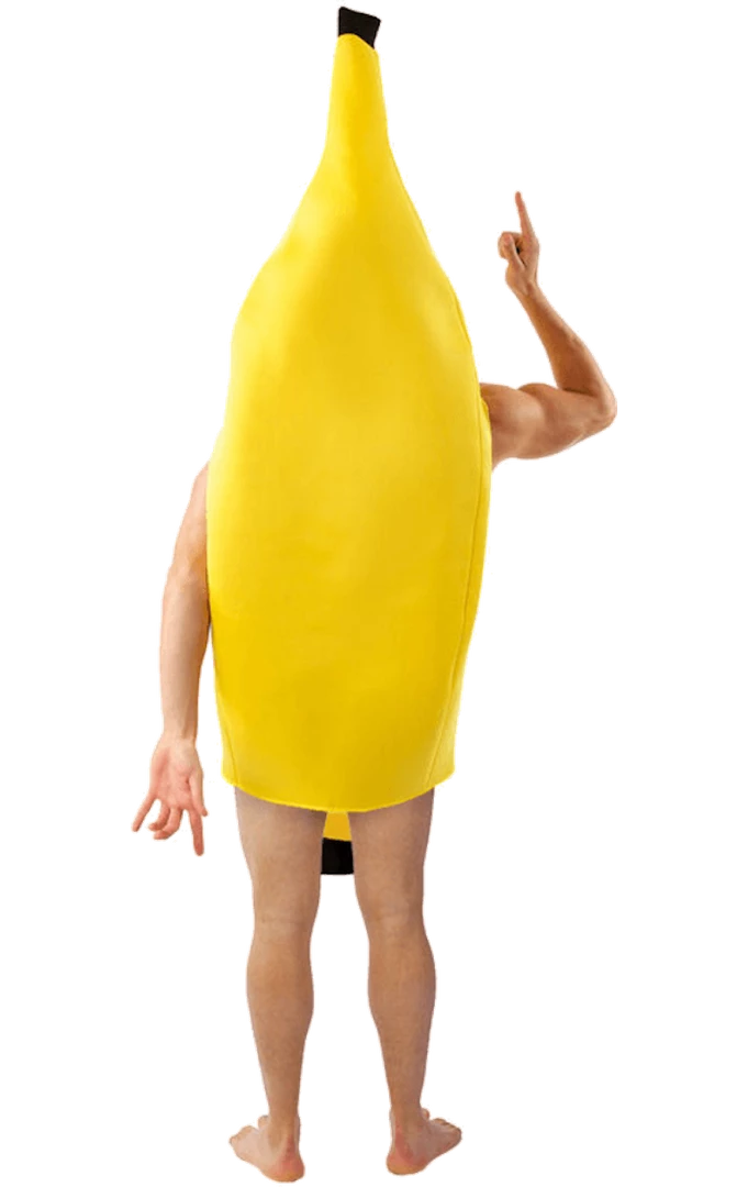 The Adult Novelty Banana Costume is made up of a vibrant yellow banana suit with cut outs for the face, arms, and legs for a comfortable fit. It also features black stalk detail to look like a real-life banana.