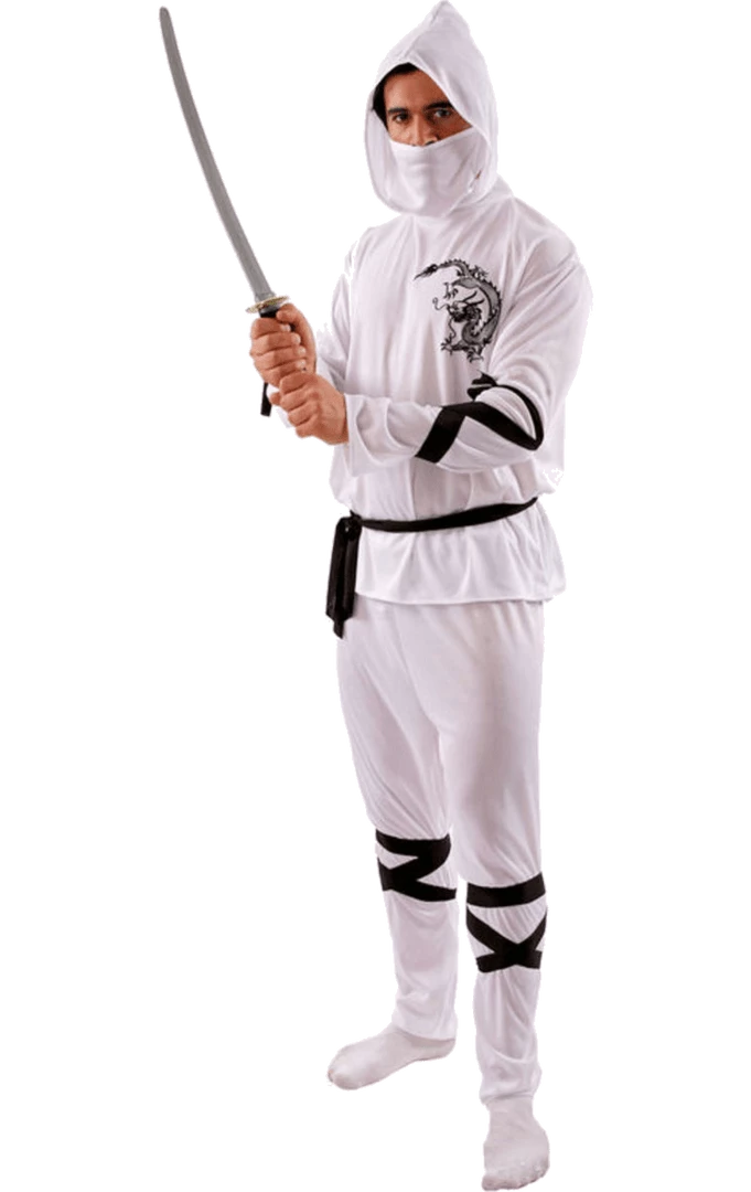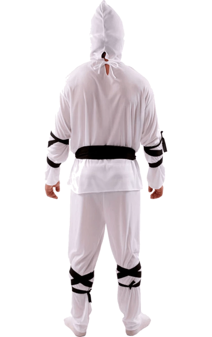 The White Ninja Costume is made up of a white long-sleeved top with intricate detailing of a dragon on the chest. It also includes a matching pair of white trousers. Completing your ninja outfit are black arm and leg ties and a white headpiece.