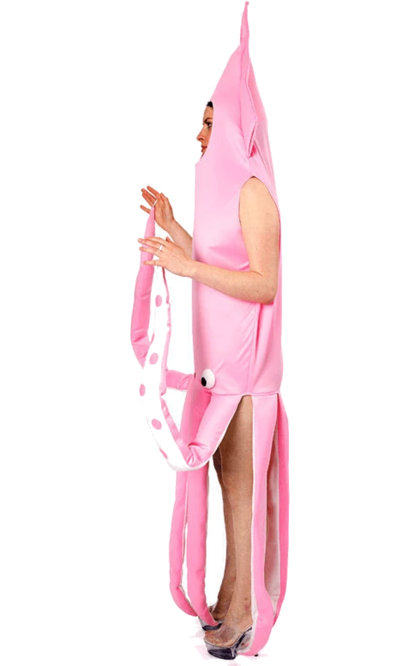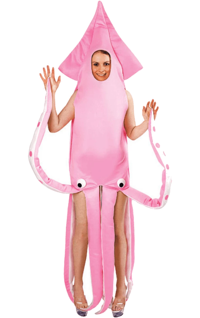 The Adult Pink Squid Animal Costume is made up of an all-in-one pink tunic with a cut out for the face. It also includes a pointed hood, googly eyes on the front and padded tentacles with loops on the end, so you can attach them to your fingers and dance the night away.