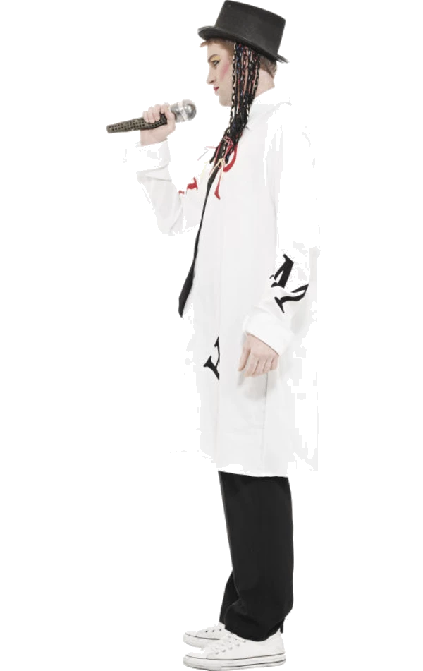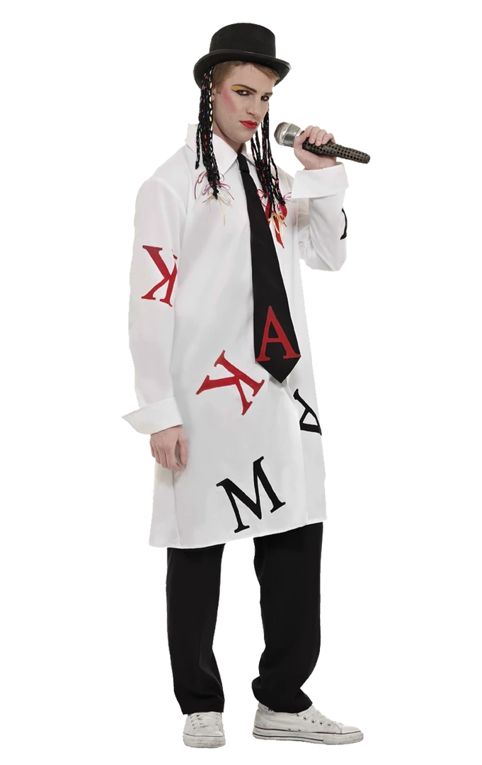 The Adult Boy George Karma Costume is made up of an oversized white shirt with large black and red letters printed on the front, as well as a an attached black tie. The costume also includes a black top hat with attached hair and a microphone, so you can sing and entertain all night long.