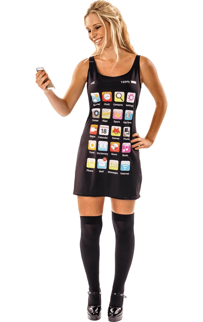 The Womens iMobile Novelty Costume features a black, vest-style mini dress, with an app home screen design on the front and a grey ‘pear’ logo on the reverse, giving it that extra comical effect.