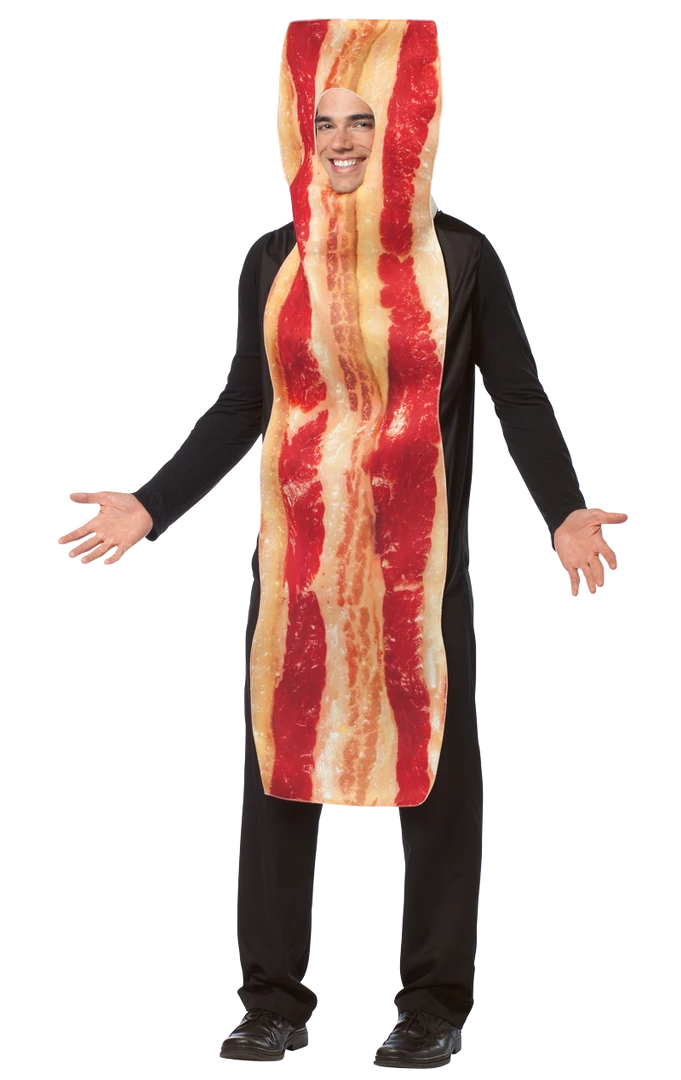 Make the party sizzle with this meatastic Bacon Strip costume! It’s an outfit sure to have people carving out a way to talk to you all night. Spread the giggles with our slice of fun and remember to keep away from the frying pan. One size poly foam costume that fits most adults.