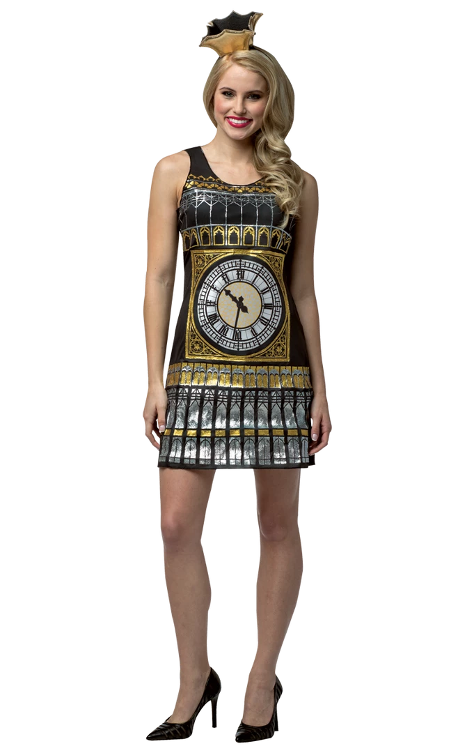 Amazing shiny gold and silver on black Big Ben dress. Look stunning dressed as one of London’s most iconic landmarks! Ladies tunic style dress with headband.