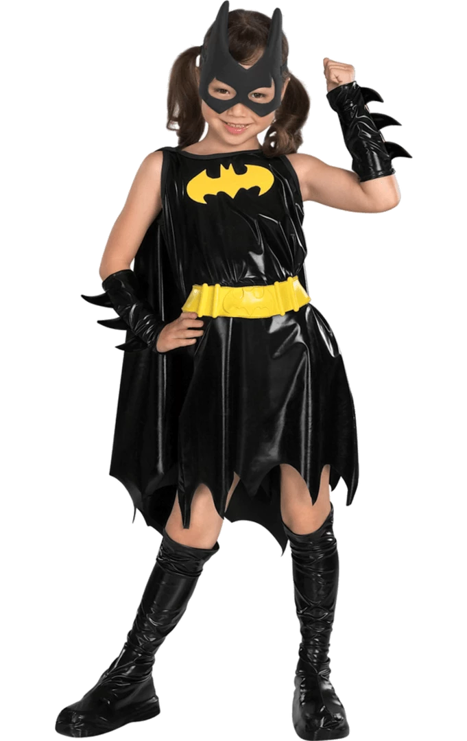 The Kids Deluxe Batgirl Costume is made up of a shiny black dress with a jagged bottom, featuring a vibrant yellow bat logo on the chest. The costume also includes an attached black cape, a bright yellow belt, boot tops and black gauntlets with spikes on either side. Completing the look is a batgirl headpiece that will conceal her identity as she saves the people of Gotham, or haves fun at the party.