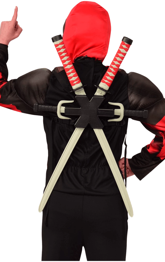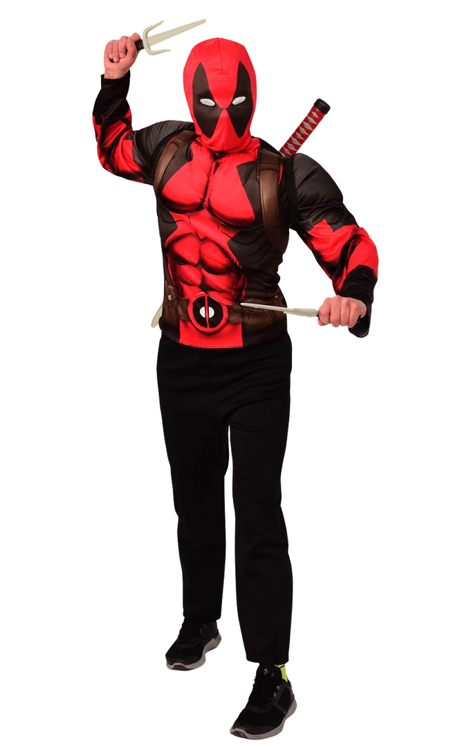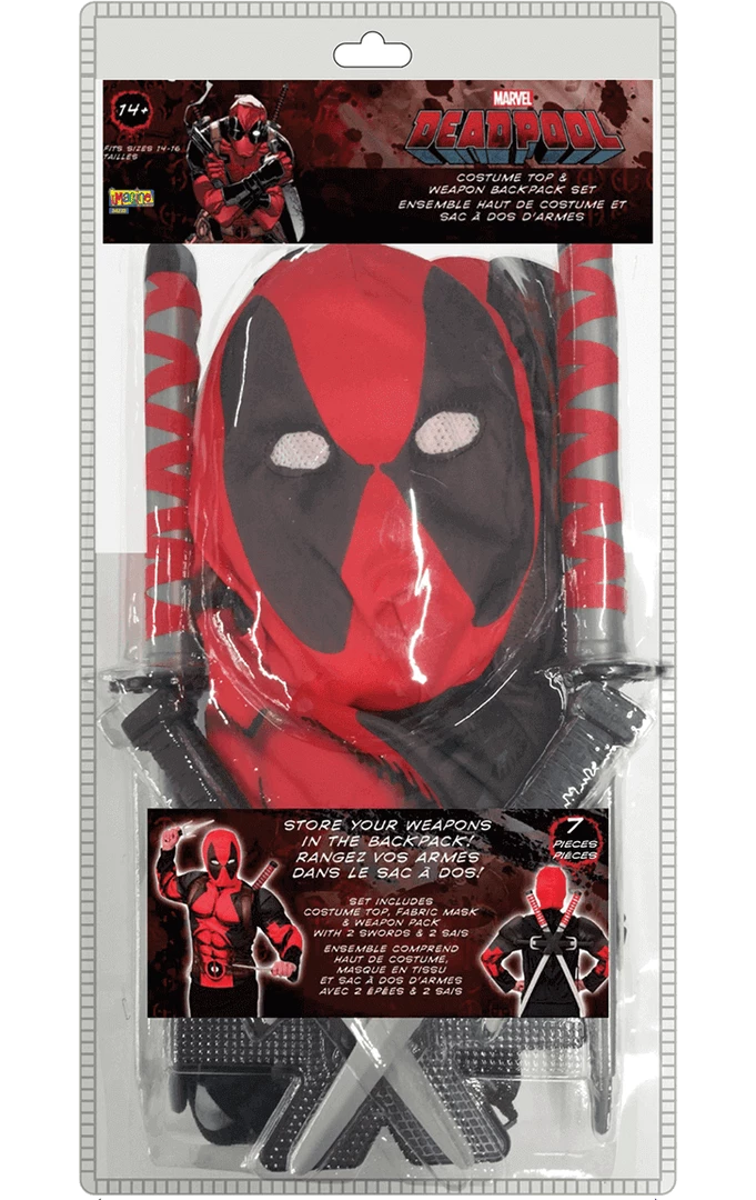 ”Whatever they did to me, they made me totally indestructible…” Show off your immortal side with our fully licensed Deadpool Top & Weapon Kit! Cuss and battle your way to superhero royalty with this brilliant costume package! Featuring a printed top with Deadpool’s trademark suit pattern, plus a wearable weapon kit including a sword and two smaller daggers. You’ll be prepare for battle and look totally awesome at the same time. Rock on!