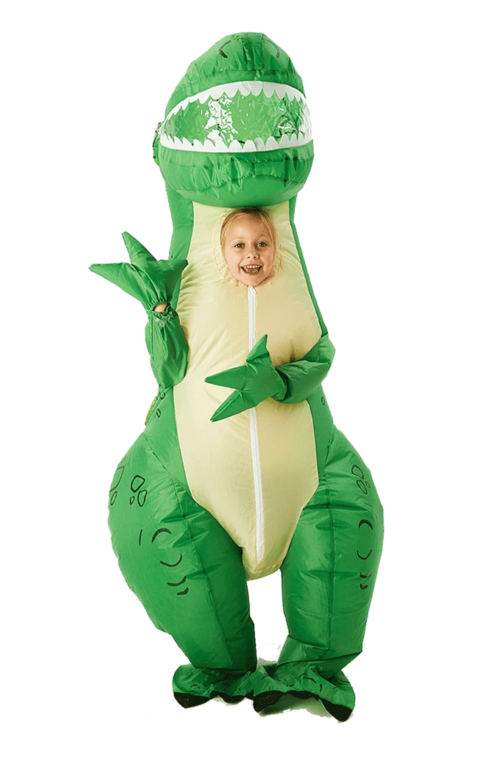 The Kids Toy Story Inflatable Rex Dinosaur Costume features a zip-up fronted bodysuit with battery-powered fan, attached gloves and a face hole. Simply insert 4 AA batteries and watch as the costume magically inflates and your child is ready for their Toy Story party or World Book Day event at school.