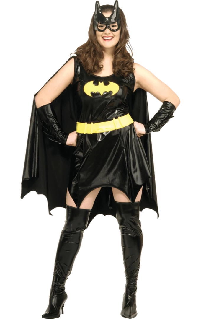 The Womens Batgirl Plus Size Costume is made up of a leather-look black dress with the vibrant yellow bat logo in the centre of the chest, plus an attached black cape. The costume also includes a detachable yellow utility belt, leather-look arm gauntlets with spikes and matching knee-high boot tops. Completing the look is a black eye piece to disguise your identity whilst you fight crime in Gotham City.