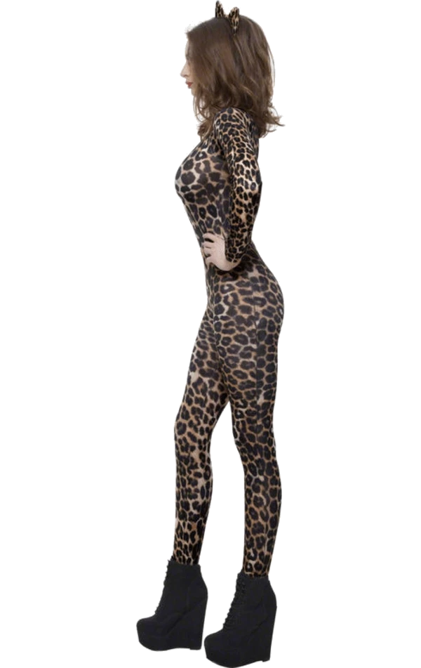 Let out your inner cat in this Leopard Print Bodysuit. Let our a little growl and a meow at fellow party guests as you rock up in this sexy one piece. It fully shows off all the best curves of your figure, just add some cat face paint and cat eye accessories for a realistic look. Included is a sheer body suit only. Headband ears available separate.