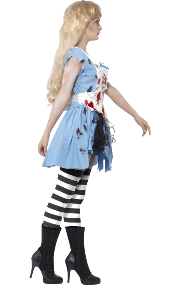 The Adult Zombie Alice Costume features a blue knee-length dress that has a ragged sleeves and hem to make it look like she’s had a tough night. Also included is a white apron with blood stains dotted all over. To finish off the look, the outfit comes with a red headband. If you want to take your possessed Alice look to the next level, then pop on some white face paint, practice that zombie walk and splash over more fake blood!