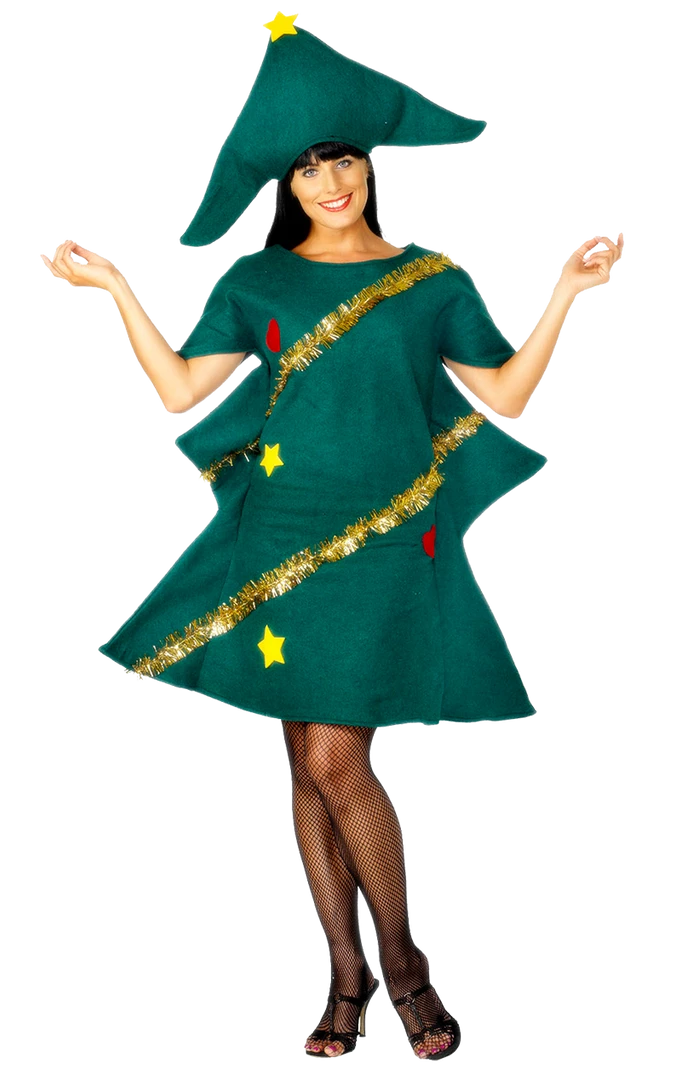 The Adult Christmas Tree Costume is made up of dark green, Christmas tree-shaped dress, complete with gold tinsel and heart and star motifs printed on the front. Finishing the look is a matching hat with a star topper, so no one can mistake you as the icon of the festive period.