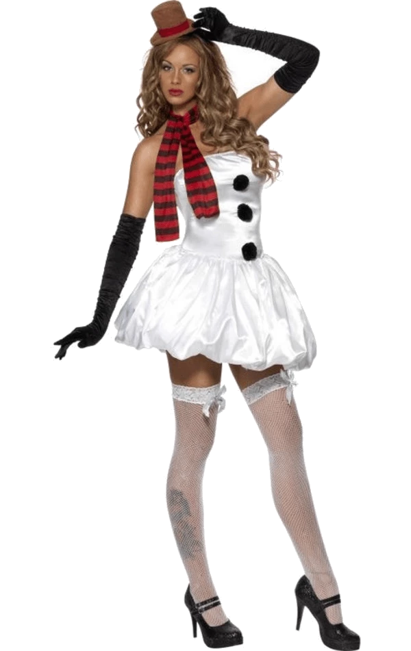 The Sexy Snow Woman Costume is made up of an elegant strap-less white dress with puffed skirt, and three black pom poms down the centre for the ‘buttons’. The outfit also includes a striped red and brown scarf with matching mini top hat on a headband, giving it a stylish twist.