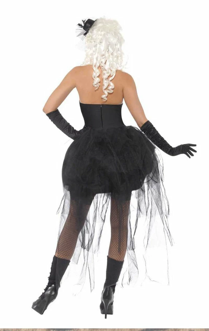 Skelly Von Trap dress has a printed skeleton design on the bodice with thin shoulder straps and the attached skirt has a ragged net petticoat attached. An elegant, gothic look, perfect for a historical Halloween party!