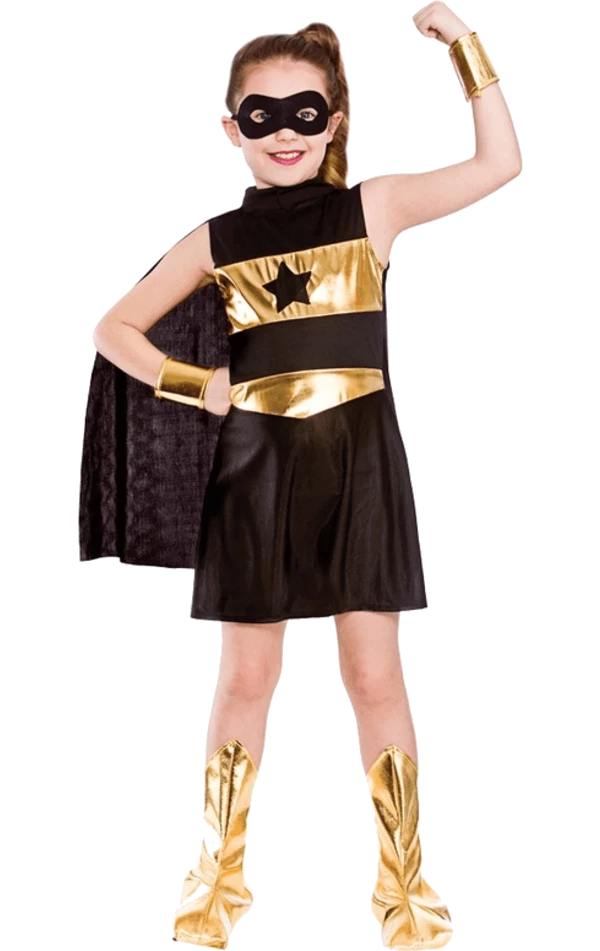 The Girls Black Superhero Costume features a black dress with gold accents around the waist and the chest, with a printed star. Also included is a black cape that’s attached to the dress. To complete the all-time superhero look, a black mask with eyeholes and a pair of shiny gold boot covers are included.